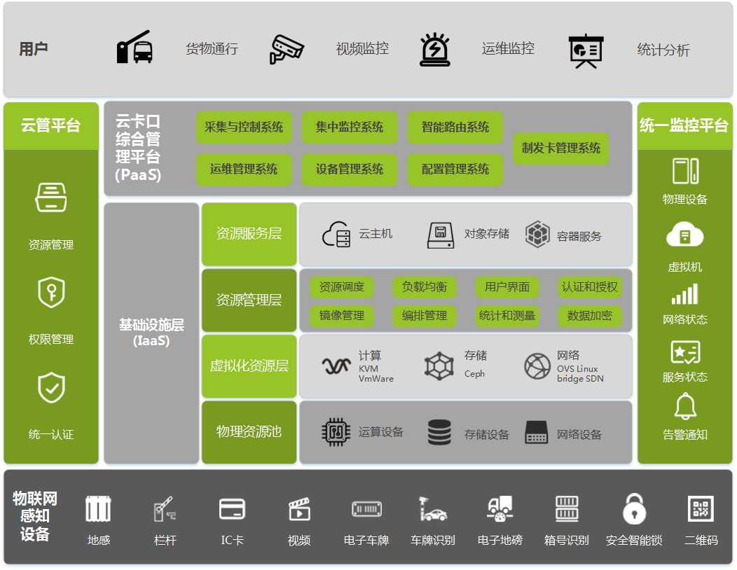 智能云卡口平台是新一代的云卡口产品,顺利获得安装在海关监管场所卡口通道的电子地磅、集装箱箱号识别、电子车牌识别、电子栏杆、安全智能锁等各类智能化采集控制设备,对进出海关监管场所的运输工具及其货物等监管对象进行信息自动采集和控制,顺利获得后台数据库对其进行合法性验核、逻辑性判断,实现智能化监控管理的设备集成和应用管理系统。