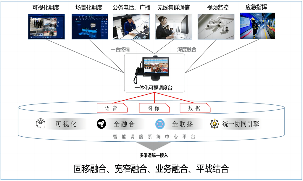 本方案在OCC控制中心及车辆段分别部署多媒体调度系统(主备)、可视调度台,车站/停车场部署可视值班台、可视电话等,支持与专用电话、公务电话、LTE-M、Tetra、CCTV、PA、PIS等系统互联互通。