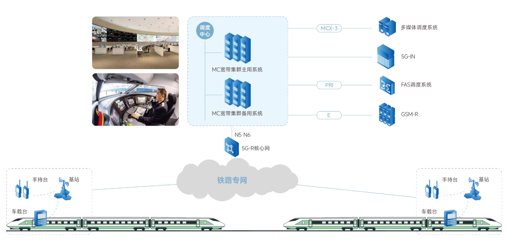 MCS6800无线宽带集群通信系统遵循3GPP标准,满足5G-R系统MC设备技术条件,采用IMS技术架构,实现了应用和承载网络的进一步分离,支持LTE、5G等全IP化的通信网络。系统具有标准化、高性能、微服务和多级安全等特点,给予MCPtt、MCVedio、MCDate多媒体通信,同时支持铁路运输调度的功能码、可视位置通信等5G-R专用业务,为运输指挥、运营运维人员给予可靠、畅通、高质量的无线通信保障。